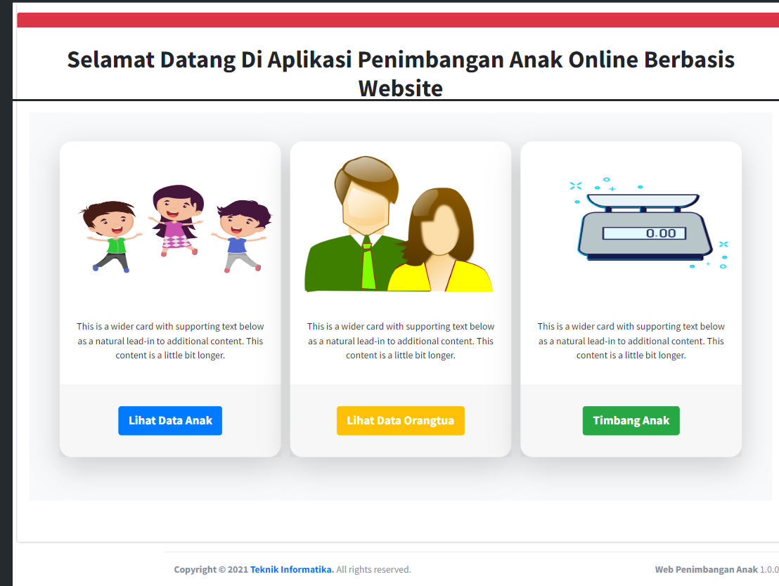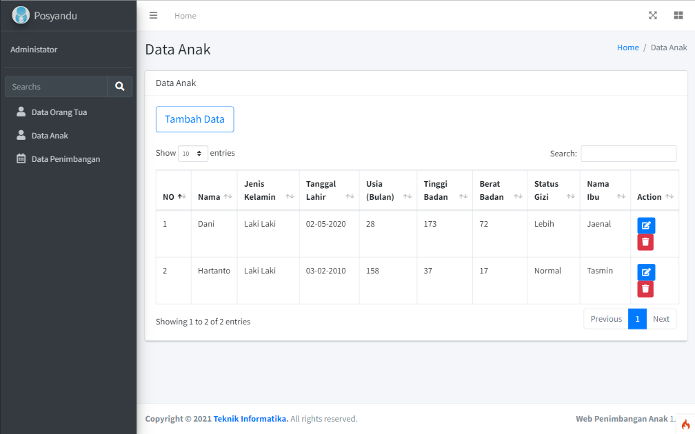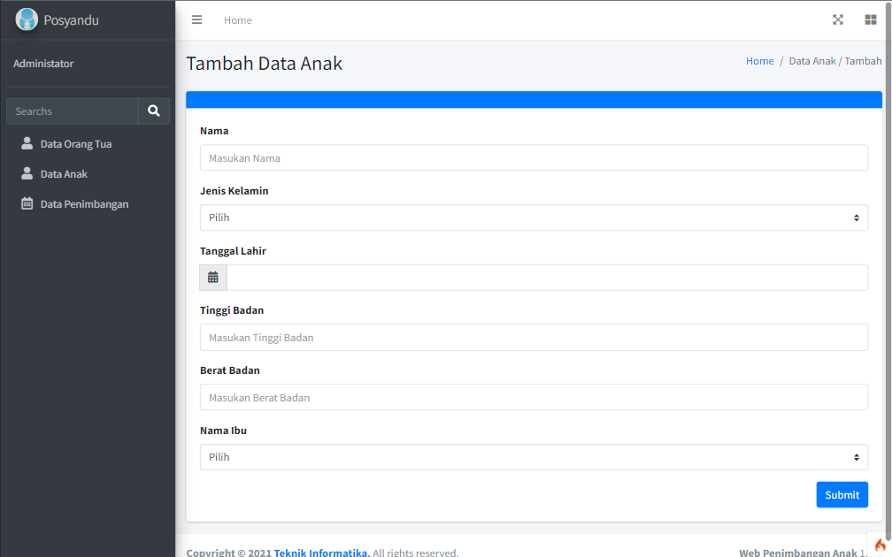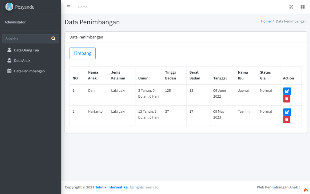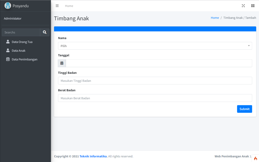 - Website yang diperuntukkan bagi pelayanan Posyandu terutama bagi proses penimbangan anak. Jika anak sudah di timbang dan diukur tinggi badannya, maka akan di ketahui nilai gizi anak tersebut apakah masuk ke dalam kategori kurang gizi, normal, atau kelebihan gizi.